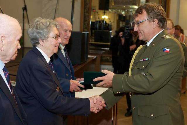 Plzeňský primátor Martin Baxa předává medaili Michelu Gilainovi, vlevo stojí Louis Gihoul. Oba jako příslušníci belgického 17. střeleckého praporu osvobozovali Plzeňsko.