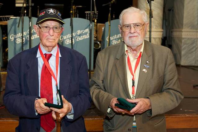 Američtí veteráni Robert Gilbert (97 let) James Duncan (vpravo). Oba v květnu 1945 osvobozovali Plzeň.