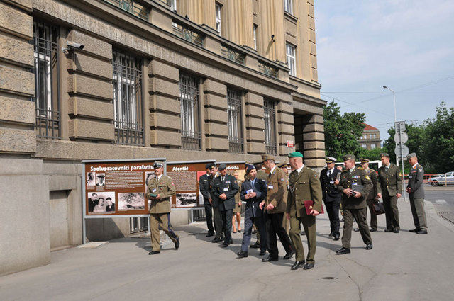 Hosté velitele Velitelství posádky Praha na pražském Vítězném náměstí před budovou Generálního štábu AČR
