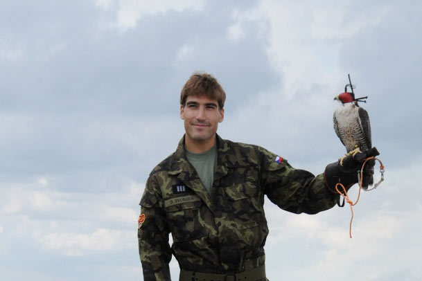 Moderní pětibojař David Svoboda drží při focení kalendáře Dukly káně, které na letišti ve Kbelích používají k plašení ptáků a další zvěře