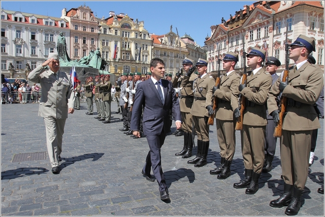 Ilustrační foto - náměstek ministra obrany pro personalistiku Michael Hrbata spolu s velitelem posádky Praha plukovníkem Pavlem Kantorem společně zdraví a zahajují exhibiční vystoupení
