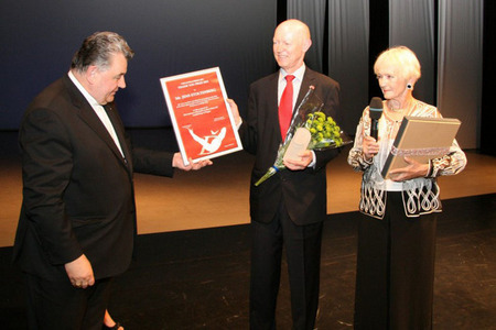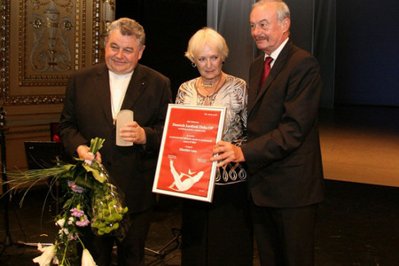 Dominiku kardinálu Dukovi předal Cenu Ď první místopředseda Senátu PČR Přemysl Sobotka společně se zakladatelkou hnutí „Na vlastních nohou“ Bělou Gran Jensen