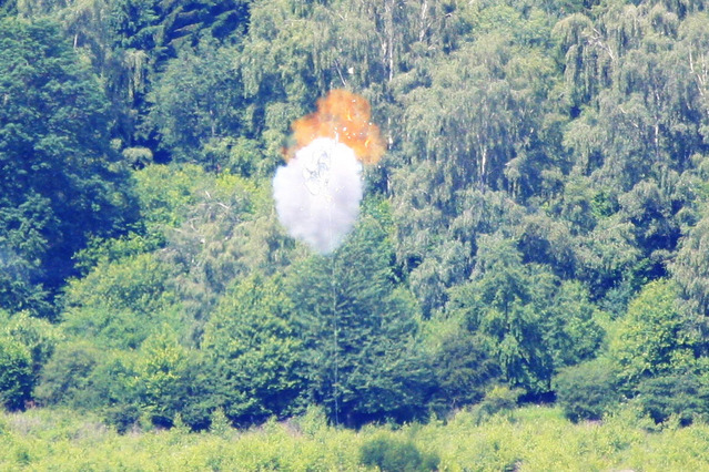 Na snímku jev dálce vidět dým po explozi hlavice řízené střely a cílový bezpilotní letoun, který začíná padat po křídle k zemi