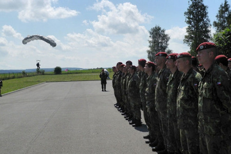 Přistání výsadkového instruktora na nástupiště