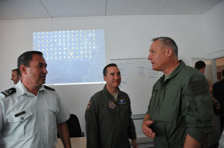 Počínání posádek vrtulníků sledují (zleva) podplukovník Robert Papš, velitel vzdušných sil AČR generál Jiří Verner a velitel přerovské základny plukovník Miroslav Šebesta