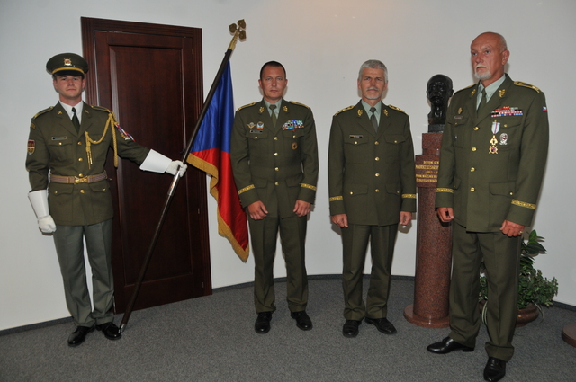 Společná fotografie u bysty generála Pellého, vpravo vedle státního praporu: generál Milan Kovanda, pověřený velením společných sil, náčelník GŠ AČR generál Petr Pavel a odcházející velitel - generál Hynek Blaško