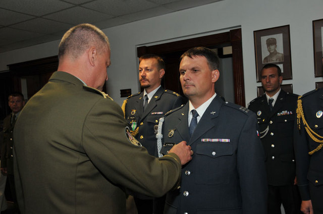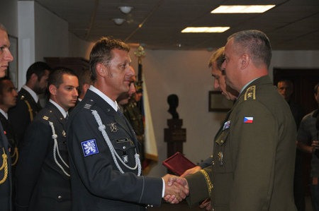 První zástupce náčelníka GŠ AČR generál Miroslav Žižka blahopřeje k udělenému vyznamenání podplukovníku Jaroslavu Faltovi
