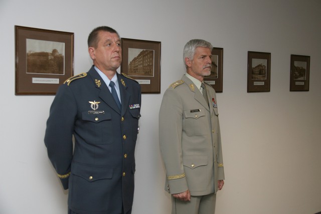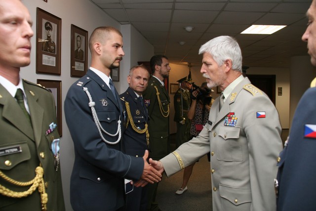 Generálporučík Petr Pavel a brigádní generál Jaroslav Kankia předávají věcný dar podplukovníkovi Vladimíru Peterovi a nadrotmistrovi Jiřímu Tvarohovi