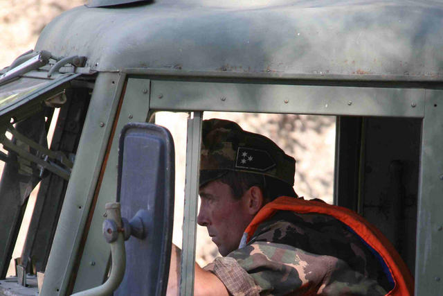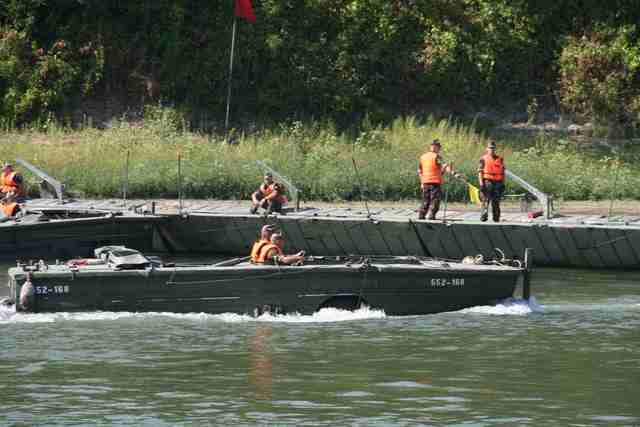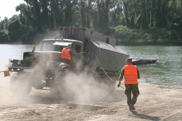 Automobil KraZ spouští na řeku pontonovou soupravu.