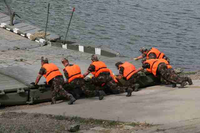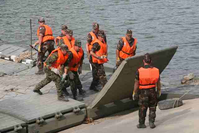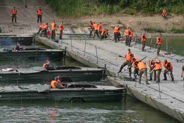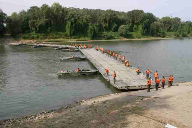 Chybí pár posledních úkonů, čluny stále ještě přidržují most v proudu řeky.