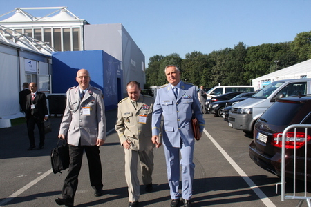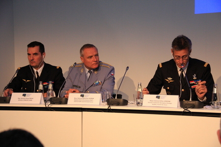 Zleva přidělenec obrany SRN v Praze podplukovník Andreas Meister, přidělenec obrany ČR v Německu brigádní generál Pavel Rybák a zástupce náčelníka Generálního štábu brigádní generál Bohuslav Dvořák spěchají na odbornou konferenci