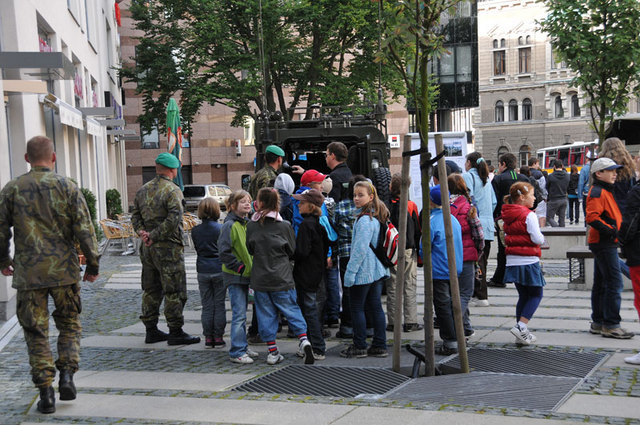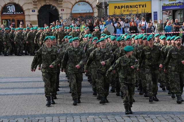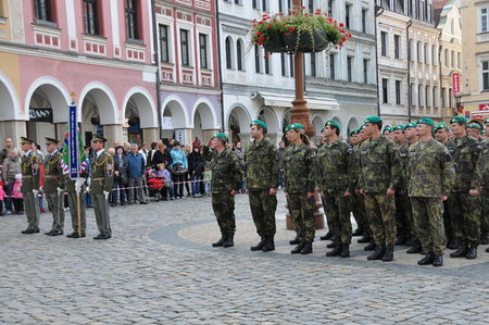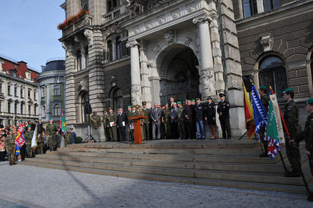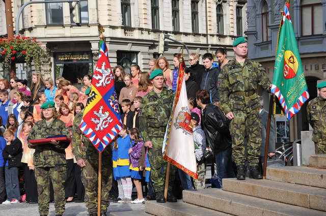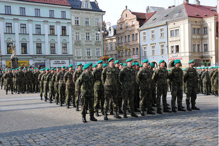 Hosté slavnostního nástupu libereckých vojenských chemiků před vchodem do radnice