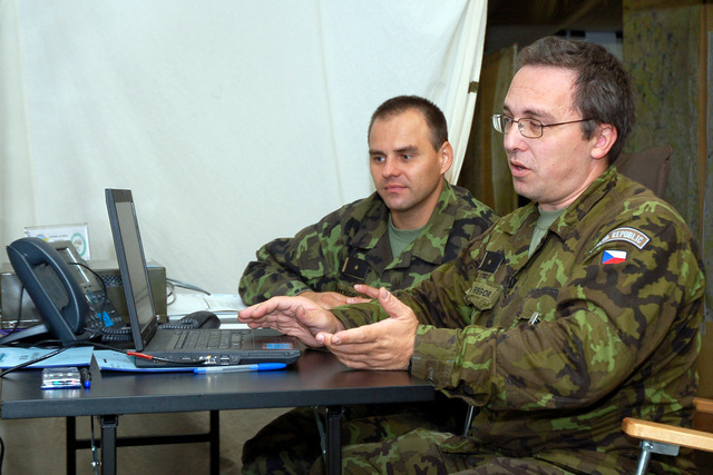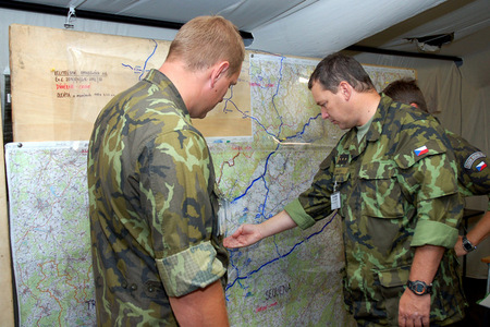 Plukovník Karel Schuch při rozhovoru s podplukovníkem Tomášem Špokem, náčelníkem střediska plánování a řízení boje 11. divize