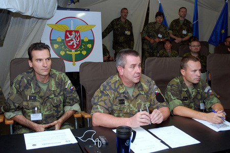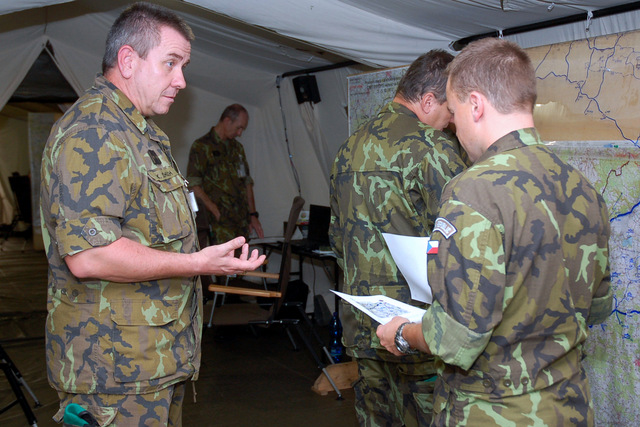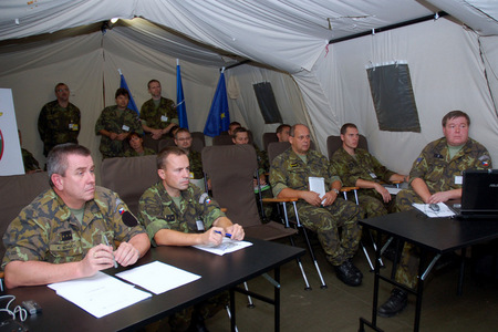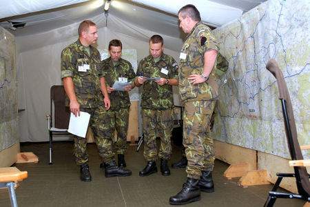 Zástupce náčelníka štábu pro věci operační Velitelství společných sil plk. Karel Schuch objasňuje velitelům brigád operační rozkaz pro provedení obranné operace