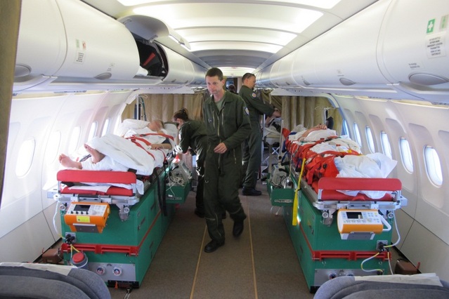 Vojenský zdravotnický personál při péči o zraněné na lůžkách resuscitační péče na palubě Airbus A-319 CJ Armády České republiky