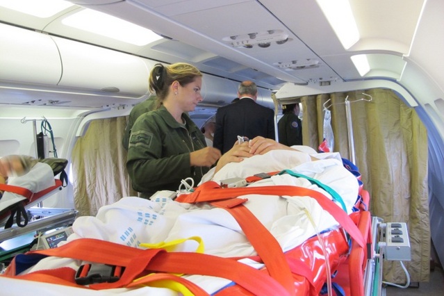 Péče o zraněné české turisty na palubě letounu Airbus A-319 CJ Armády České republiky se zdravotnickou vestavbou
