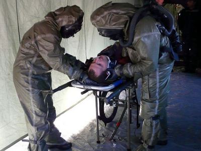 Vojáci prodávějí dekontaminaci zasažené osoby