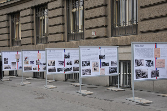 Část panelů výstavy, která mapuje vznik spojovacího vojska české armády, před Generálním štábem AČR v pražských Dejvicích