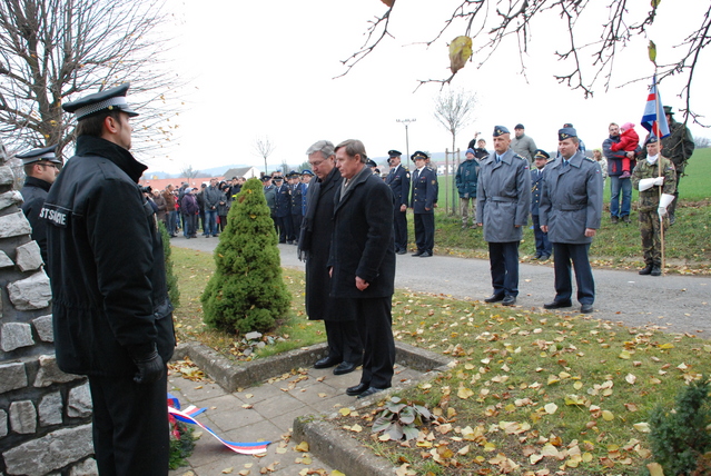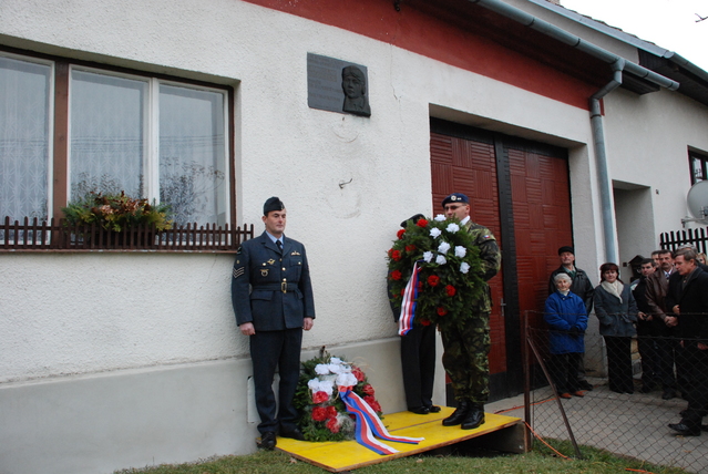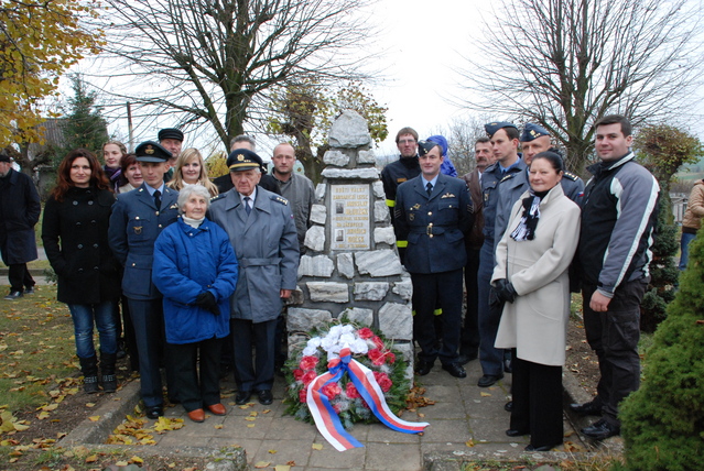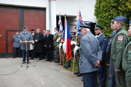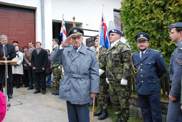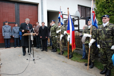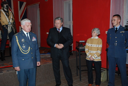 Slavnostní zahájení vernisáže, zleva: plk. Emil Boček, starosta města Vlastimil Bařinka, sestra J. Hloužka Marie Štěpánková, Josef Vochyán – Czech Spitfire Club Jihlava