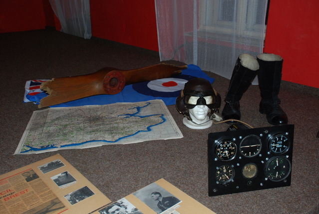 Součásti dobové výstroje pilota a originál vrtule z letounu Praga E-39, na kterém mladý Hloužek létal během leteckého výcviku v Brně