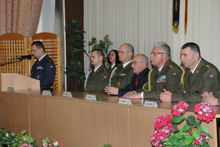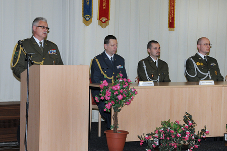 Zástupce náčelníka Odboru kariérové přípravy VeV-VA mjr.Jaroslav Medek hovoří k čerstvým absolventům za přítomnosti významných hostů
