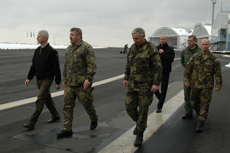 Zleva: náčelník GŠ AČR generálporučík Petr Pavel, jeho zástupce generálmajor Aleš Opata a další armádní představitelé přišli pozdravit vojáky, kteří se vrátili z afghánského Lógaru