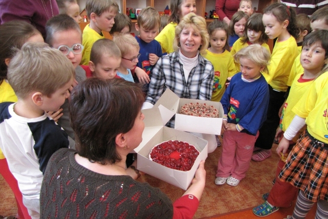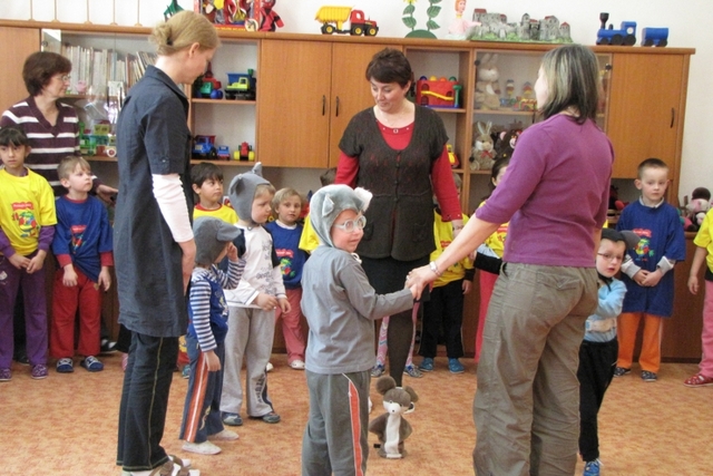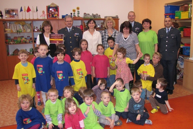Společná fotografie příslušníků brigády s dětmi a učitelkami mateřské školy speciální.