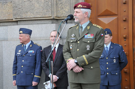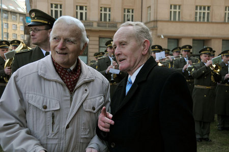 Bývalí šéfdirigenti vojenských hudeb podplukovník v.v. Jindřich Brejšek ( v popředí) a podplukovník v.v. Karel Bělohoubek obdrželi od náčelníka GŠ AČR generálporočíka Petra Pavla pamětní minci
