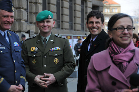 Nově otevřenou výstavu si prohlédl s hosty také náměstek ministra obrany pro personalistiku Michael Hrbata - zleva: zástupce náčelníka GŠ AČR generál Bohuslav Dvořák, vrchní praporčík Petr Seifert, náměstek ministra obrany Michael Hrbata a komunikační manažerka náčelníka GŠ AČR Mira Třebická