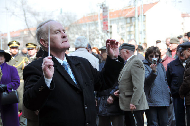 Bývalý šéfdirigent vojenských hudeb pplk v.v. Jindřich Brejšek si při vernisáži připomněl chvíle kdy řídil vojenské hudby i s taktovkou