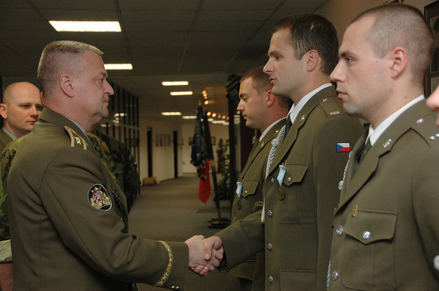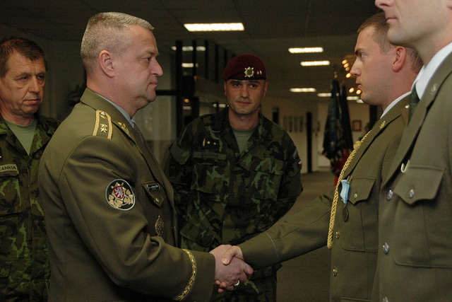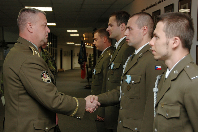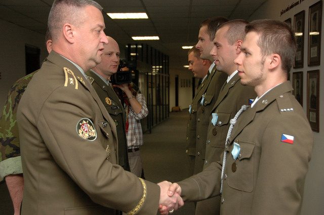 Generálmajor Miroslav Žižka gratuluje oceněným. Slavnostního nástupu se zúčastnil také brigádní generál Jaroslav Kankia (vlevo) (1)
