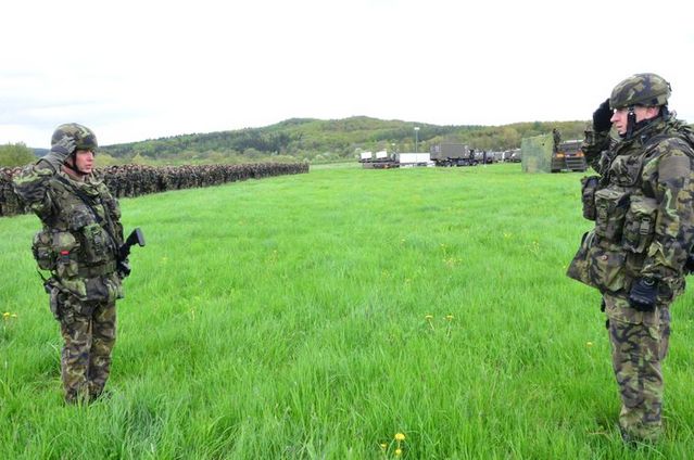 Zástupce velitele 4.brigády rychlého nasazení plukovník gšt. Antonín Genser předává hlášení veliteli 4.brigády plukovníku gšt. Miroslavu Hlaváčovi