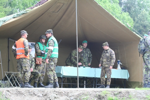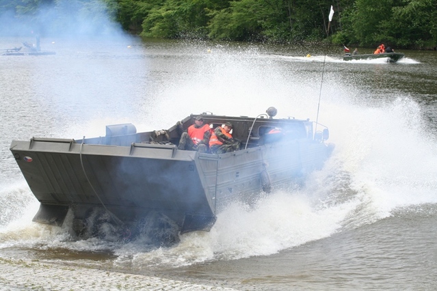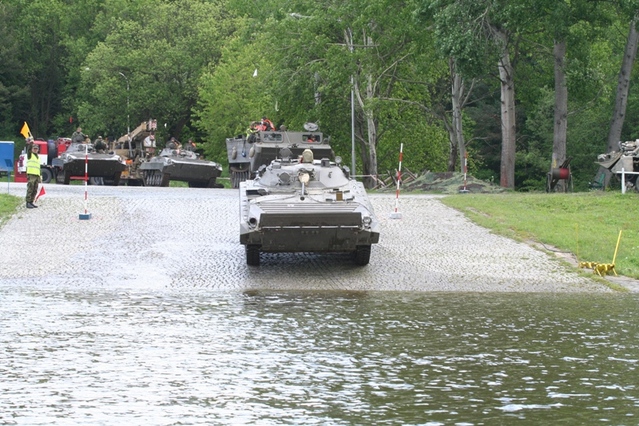 Velitel BVP ve věži pomáhá navigovat řidiče a vizuálně kontroluje prostor kolem vozidla. V pozadí je stan s řídícími plaveb, kteří po celou dobu sledují pohyb vozidel a zvládání jednotlivých překážek.