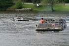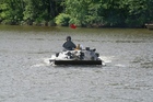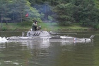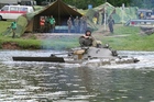 Příslušníci praporu zabezpečení Vyškov předvedli ukázku zásahu vyproštění BVP z vody. Na snímku je zachycen vjezd vyprošťovacího obrněného transportéru PTS-10 do vody.