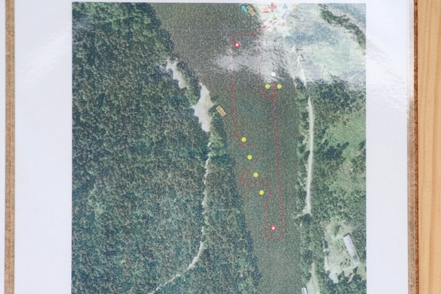 Mapa vodní nádrže Myslejovice ve VVP Březina a grafické znázornění dráhy a překážek pro výcvik plaveb.