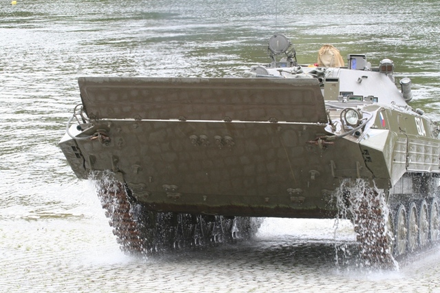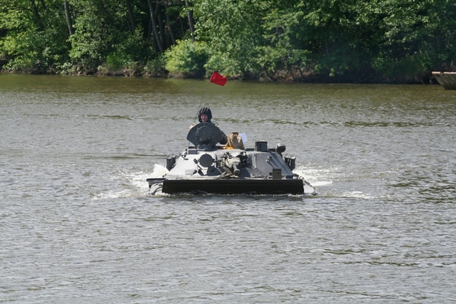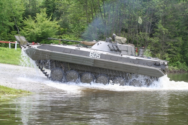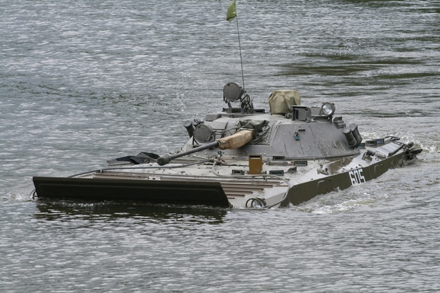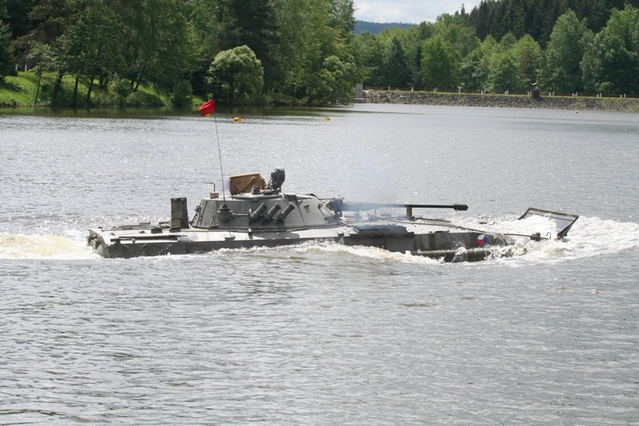 Plovoucí BVP, na snímku lze dobře vidět funkci vlnolamu, který zabraňuje tomu, aby šla voda přes věž vozidla, popřípadě se dostala do prostoru sání vzduchu do motoru