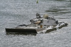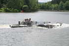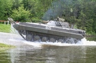BVP těsně po výjezdu z vody, na snímku lze vidět ještě vyklopený vlnolam, který se vzápětí sklopí nahoru, na příď vozidla.