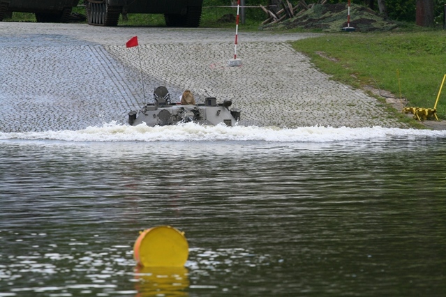 Za pár okamžiků BVP přestane plovat a jeho pásy se „zakousnou“ do pevného podloží brodu. Poklop věže je uzavřen a vozidlo bezpečně opustí vodní překážku.