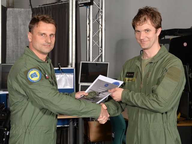 Zástupce pořádající Evropské obranné agentury (EDA) Miloš Pecha předává absolventský certifikát kpt. Filipovi Křivdovi