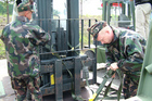 Maďarští vojáci uvolňují vysokozdvižný vozík z přepravní plošiny během cvičení Collective Effort 2004