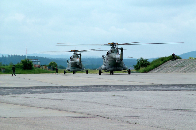 Dvojice vrtulníků Mi-17 připravená ke vzletu z letiště Planá u Českých Budějovic v rámci plnění přepravních úkolů během cvičení Collective Effort 2004
