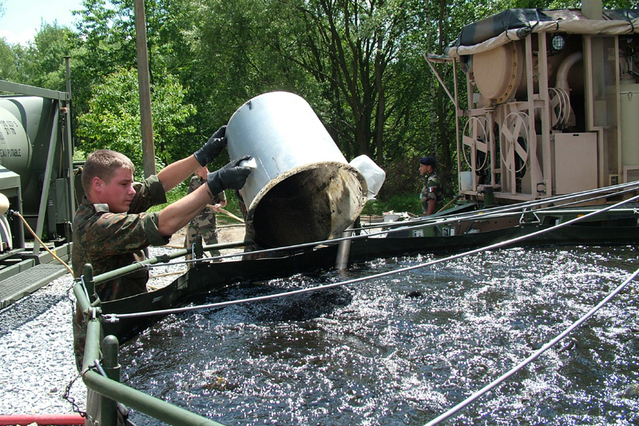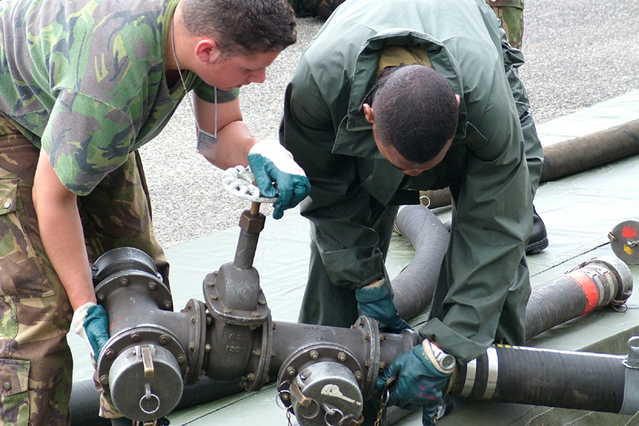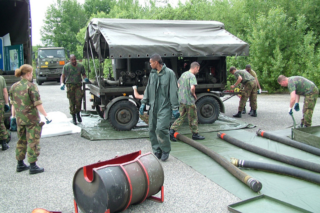I při polním přečerpávání paliva se dodržují přísné ekologické normy a vše musí být odděleno od podloží nepropustnými podložkami proti náhodnému průsaku (foto ze cvičení Collective Effort 2004)