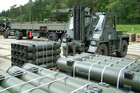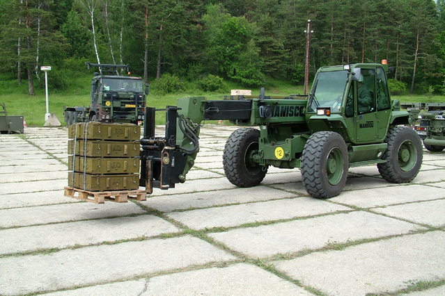 Speciální technika manipuluje s bednami s municí na paletě během cvičení Collective Effort 2004