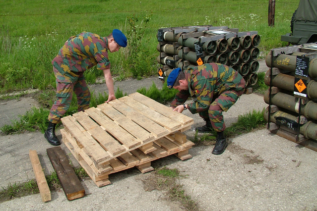 Belgičtí vojáci připravují palety pro munici během cvičení Collective Effort 2004