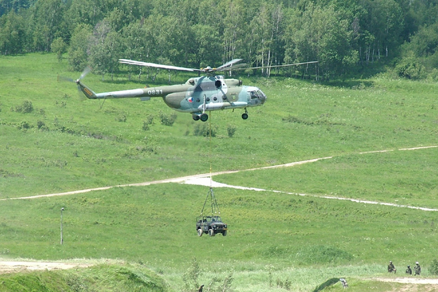 Přeprava terénního automobilu v podvěsu pod vrtulníkem Mi-17 během cvičení Collective Effort 2004
