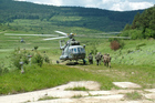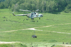 Dvojice vrtulníků Mi-17 přistává ve VVP Boletice během cvičení Collective Effort 2004