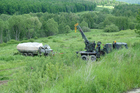 Ukázka vyprošťování nákladního vozidla po simulované nehodě v terénu během cvičení Collective Effort 2004