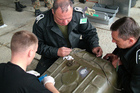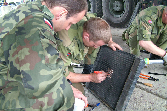 Technici při opravě prostříleného chladiče během cvičení Collective Effort 2004
