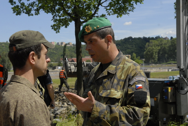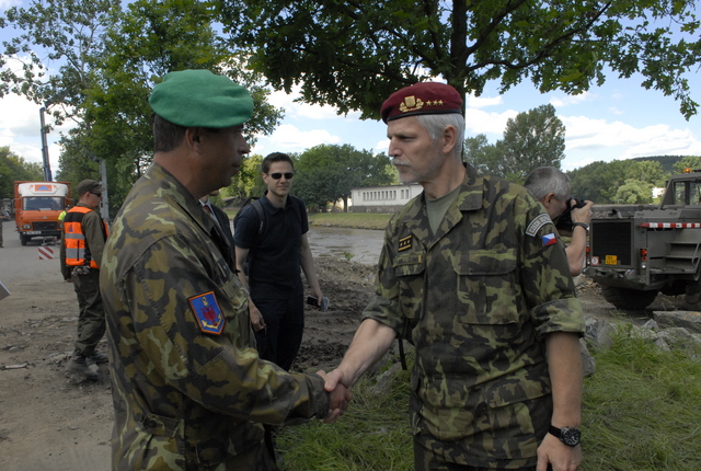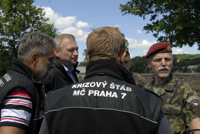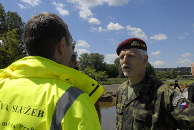 Ministr obrany Vlastimil Picek a NGŠ AČR generálporučík Petr Pavel monitorují aktuální stav na Císařském ostrově