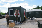 Němečtí vojáci při připojování klimatizace k jednomu ze zdravotnických modulů